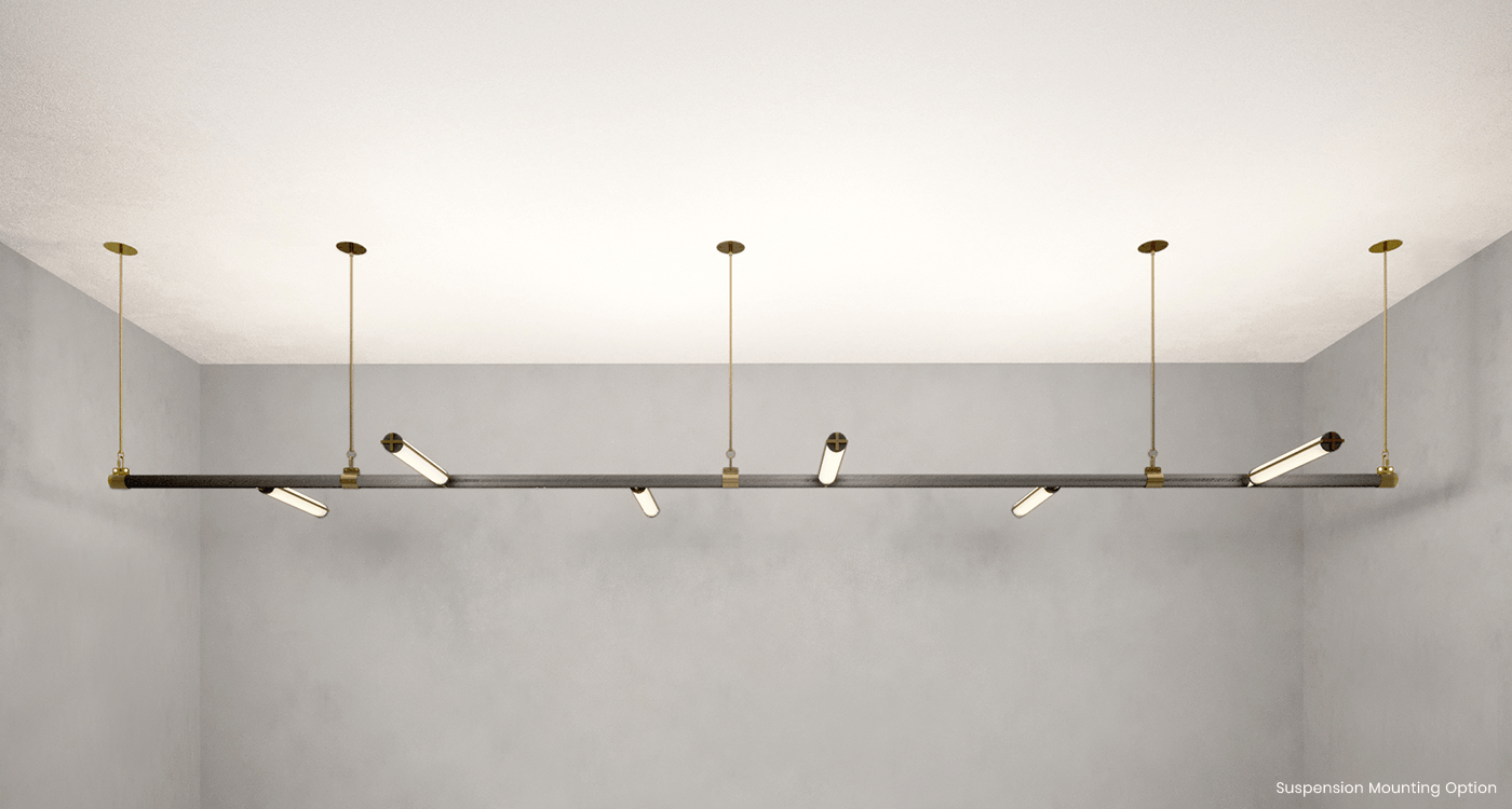 The Metropolis Wall-to-Wall System began as (you guessed it) a wall-to-wall installation. With parallel or perpendicular walls, users can span the system across a room or in an L shape using a corner attachment. Two end pieces mount to walls and use suspended anchors along the fixture for added support. The drop height of your fixture is customizable to fit your space.