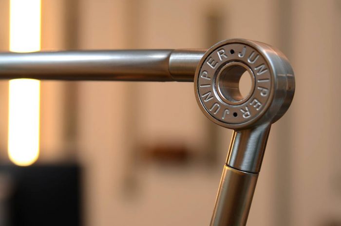 The THIN Floor Lamp features a solid brass 1/2-inch body, articulating hinge and ball joint at the lamp’s cast iron base to expand and contract for an adjustable minimal lighting solution. The THIN Floor Lamp boasts a frosted lens that casts a focused light beam controlled by an onboard dimming knob at the lamp’s tip.